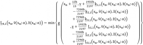 ${{\underline{\text{L}}}_{2,1}}\left( {{\text{x}}_{\text{n}}},\widetilde{\text{v}}\left( {{\text{x}}_{\text{n}}};\alpha \right),\widetilde{\text{z}}\left( {{\text{x}}_{\text{n}}};\alpha \right) \right)=\min \left\{ \underline{\text{g}}\left( \begin{matrix} {{\text{x}}_{\text{n}}}+\frac{\text{h}}{4},\underset{\scriptscriptstyle-}{v}+\frac{\text{h}}{4}{{\underline{\text{k}}}_{1,1}}\left( {{\text{x}}_{\text{n}}},\tilde{v}\left( {{\text{x}}_{\text{n}}};\alpha \right),\widetilde{\text{z}}\left( {{\text{x}}_{\text{n}}};\alpha \right) \right) \\ \underline{\text{z}}+\frac{\text{h}}{4}{{\underline{\text{L}}}_{1,1}}\left( {{\text{x}}_{\text{n}}},\tilde{v}\left( {{\text{x}}_{\text{n}}};\alpha \right),\widetilde{\text{z}}\left( {{\text{x}}_{\text{n}}};\alpha \right) \right) \\\end{matrix} \right) \right\}$