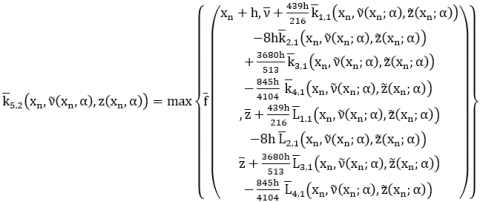 ${{\overline{\text{K}}}_{2,2}}\left( {{\text{x}}_{\text{n}}},\widetilde{\text{v}}\left( {{\text{x}}_{\text{n}}};\alpha \right),\widetilde{\text{z}}\left( {{\text{x}}_{\text{n}}};\alpha \right) \right)=\max \left\{ \overline{\text{g}}\left( \begin{matrix} {{\text{x}}_{\text{n}}}+\frac{\text{h}}{4},\bar{v}+\frac{\text{h}}{4}{{\overline{\text{k}}}_{1,2}}\left( {{\text{x}}_{\text{n}}},\tilde{v}\left( {{\text{x}}_{\text{n}}};\alpha \right),\widetilde{\text{z}}\left( {{\text{x}}_{\text{n}}};\alpha \right) \right), \\ \overline{\text{z}}+\frac{\text{h}}{4}{{\overline{\text{L}}}_{1,2}}\left( {{\text{x}}_{\text{n}}},\tilde{v}\left( {{\text{x}}_{\text{n}}};\alpha \right),\widetilde{\text{z}}\left( {{\text{x}}_{\text{n}}};\alpha \right) \right) \\\end{matrix} \right) \right\}$