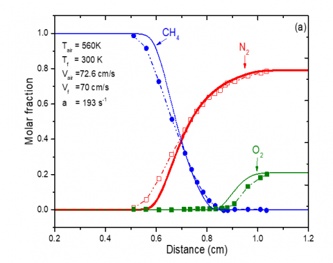 Oppdiff program developed by Lutz et al. [20] is used to solve Eqs. (2)-(5) considering a Lewis number different the unity [22] and a low Mach number. Chemical kinetics is represented by the GRI-Mech 3.0 mechanism which includes 53 species and 325 elementary reactions [23].