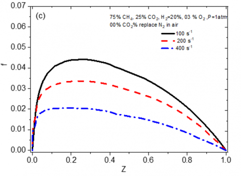 where, Tnr and Tr denote the adiabatic and radiating flame temperatures respectively. Figure 3 illustrates the evolution of f in the mixture fraction space for several operating conditions. It is noticed that the enrichment in oxygen and the increase in CO2 fractions, in the synthetic atmosphere, decrease the value of f (Figure 3(a) and (c)). On one hand, increasing oxygen in the oxidizer, in this case, enhances reaction and adiabatic flame temperature increases, which reduces the flame relative temperature. On the other hand, increasing strain rate, reduces the flame volume and obviously the radiation losses, which reduces the flame relative temperature. When CO2 volume increase in the mixture Figure 3(b), the relative temperature of the flame increases significantly since CO2 is a strong source of gaseous radiation [26].