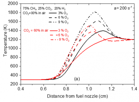 The same behavior is observed when N2 is replaced by CO2 (at CO2=60%) in the oxidizer stream for the same oxygen concentration. In this case the decrease in maximum temperature is about 16% and it is the result of the higher heat capacity of CO2 compared to N2. It should be noted that MILD regime is reached at these operating conditions since the difference between maximum flame temperature and oxidant temperature is 600 K, lower than the self-ignition temperature of the fuel mixture which is more than 800 K.