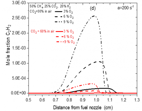 The C2H2 species is a precursor of soot formation [27] which is responsible for the nucleation of soot by these elementary reactions. Increasing the oxygen content as shown in Table 1 induces oxidation of this species. It should be noted that replacing N2 in the air with CO2 in the oxidizer stream leads to a very significant reduction in CO, C2H2 and NO.