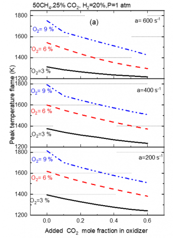 In the following, the most recent contributions on biogas-hydrogen blended flames in conventional and MILD regimes with synthetic atmosphere are reviewed. In an opposed jets configuration of CH4 /air, Park et al. [7] have numerically studied the effect of the air dilution by H2O, CO2 and N2 on the flame structure and NO emission. Detailed chemistry is adopted and heat loss by radiation at low strain rate was considered. It is found that the maximum flame temperature reduction was important when dilution is operated by CO2 followed by H2O and then N2. Despite of the high heat capacity of H2O, the reduction of the flame temperature is due to thermal effect of CO2; whereas, in the case of H2O addition the reduction results from chemical effect. In an experimental study Zhen et al. [8] considered the flame stability of a biogas enriched by hydrogen with addition of CO2 and N2. The authors found that hydrogen addition stabilize the flame; also, the increase of CO2 in biogas reduces the temperature and soot more efficiently than N2. The impacts of scalar dissipation, volume of hydrogen and carbon dioxide in the biogas, on the characteristics of the flame and its emissions have been taken into account by Mameri and Tabet [9]. The opposed jet configuration is adopted at atmospheric pressure. The authors proved that CO2 augmentation reduces flame temperature and NO emission. The flameless combustion regime approves the importance of the preheating of air flow by combustion products such as CO2 and H2O, which plays the role of a diluent by their physico-chemical properties [10, 11]