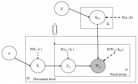 The architecture of the LDA model is hierarchical, where the observable variables are represented by the shaded circles W, and the unshaded circles z and θ pertain to the latent variables. The plates-marked by squares-symbolize repetitions, with the outer plate corresponding to documents, and the inner plate indicating the repeated selection of topics and words within a document. Hyperparameters α and β are posited at the corpus level and presumed to be sampled singularly. The variable K stands for the number of topics, and φ1,…φk is a V-dimensional vector that harbors the parameter distribution of words across topics, given V as the vocabulary size. θ consists of rows defined by documents and columns defined by topics, φ consists of rows defined by topics and columns defined by words. Thus, φ1,…,φK{1-K} refers to a set of rows, or vectors, each of which is a distribution of words. θ1,…,θM{1-M} refers to a set of lines, each of which is a distribution of topics. Document probability distribution in a document and word probability distribution in a topic.