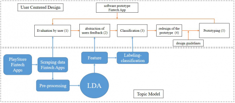 The research framework delineated in this study introduces a methodology for the development of Fintech features through the integration of topic modeling and UCeD, as illustrated in Figure 2. Traditionally, UCeD abstraction and classification involve Focus Group Discussions; however, in this schema, such discussions are supplanted by the application of the LDA model. The approach commences with the extraction of high-probability words from user reviews via the LDA algorithm, which collectively form distinct topics. These identified topics are then employed as inputs for the subsequent stages within the development process. Specifically, these inputs facilitate the developer's task in pinpointing features that necessitate creation or enhancement. Within the confines of UCeD, the methodology adopts topic modeling at various junctures: data collection, data cleansing, and topic derivation using LDA. These stages precede the discussion of feature implications, where the derived topics inform the input for stages one to three. Consequent steps encompass design formulation, prototyping, and iterative re-evaluation, culminating in the implementation of the system should no further modifications be requisite.