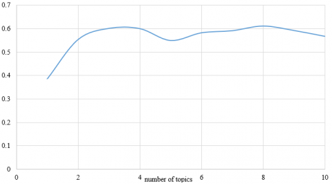The evaluation of LDA incorporates methods predicated on human judgment. The topic model identifies clusters of words, designated as 'topics', from the document's textual content without the prerequisite of semantic annotation. Given the absence of semantic anchoring, these topics may not be intrinsically interpretable. Consequently, coherence measures are employed to discern the distinction between them. A cohort of ten topics will undergo a coherence evaluation, with expertise in information systems and linguistics being pivotal for the interpretation of the lexical items. The quality of topics extrapolated from the models is measured by a specific metric known as 'topic coherence'. This metric is pivotal in gauging human comprehension of the latent topics. A significant attribute of this metric is the assessment of its value against the original corpus that served to train the topic model, rather than any external corpus. The calculation of the topic coherence score is conducted by applying the prescribed equation.