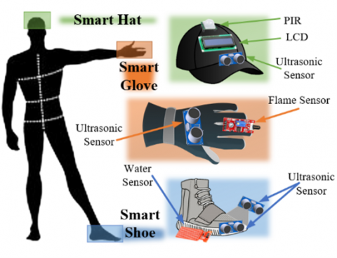 The proposed system has three separate devices that work together to achieve a desirable requirement, each of them has an Arduino board, sensors, a buzzer, and a vibrator, on which the first part of a smart glove depends. On the Arduino Uno, it is placed on a glove, while the second part, the smart shoe, is based on the Arduino Nano and is placed on a shoe. The third part is a smart hat a social distance alarm based on Arduino Uno, also invented a hat supported by a light-dependent resistor sensor, which operates a group of LEDs at night to tell the car drivers that the person who wears the hat is blind. Where these three devices and the hat together are a complete system.