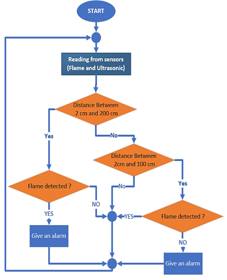 The algorithm, as shown in Figure 5, starts by reading the inputs from the two ultrasound sensors and flame sensor and then comparing their values. If the distance between the sensor and the obstacle is within the predetermined ranges and the flame sensor does not detect the flame, the alarm bell will ring at a predetermined frequency. Each range has a different frequency tone, so different sounds are generated, and the blindness distinguishes the different situations, i.e., an increase in the alert frequency to indicate the approaching obstacle. Except for these two conditions, the alarm bell will turn off.