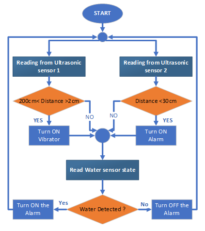 The algorithm shown in Figure 6 (a), starts by reading the inputs from the two ultrasound sensors. Each sensor value is compared to a predefined range. first ultrasonic which is responsible for detecting ground obstacles. If the distance between the sensor and the obstacle is within the range, the vibrator vibrates at a certain frequency. The vibration frequency increases as we approach the obstacle in front of it. The second ultrasonic is responsible for detecting slopes. If the distance between the sensor and the floor is within the predefined range, the alarm will trigger to indicate the presence of a pit or a slope. If the distance is less than the threshold, the bell will sound to alert you. Moreover, a water sensor is used to detect water on the floor by playing the alarm bell with a different tone and intermittently according to a certain delay time.
