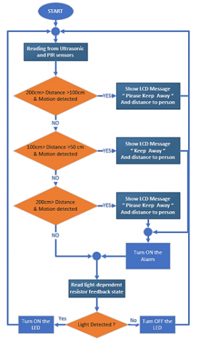 The algorithm shown in Figure 6 (b), is working for the social distance of blindness. At first, ultrasound and motion sensor values are read. If the motion sensor is detecting motion, three messages are shown on the LCD based on the distance measured by ultrasonic. The World Health Organization [22], recommends a safe distance of at least one meter between each other. If the distance is less than two meters, moreover to the message that shows on the LCD, the alarm tune is turned on with different frequencies based on the distance. When a person is detected at a distance of less than 50 cm, the system emits a powerful acoustic on the buzzer and displays the message "stay away." the distance is between 50 cm and 100 cm, a slight acoustic alarm on the buzzer is delivered by the system, and the message says: “Keep away" and when the distance is less than 2 meters, no sound warning on the buzzer is delivered by the system, and the sighted person will read the message saying: “Please keep away”. Optical resistance controls whether the LEDs are on or off.