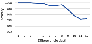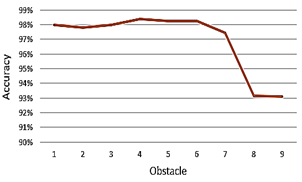 The obstacle of stairs or holes was also tested in the shoe test. Different hole depths were placed on the path of the volunteer (12 different hole depths). The volunteer shows the ability to detect and distinguish between the hole’s depth while using the proposed system, with a different sound frequency corresponding to a specific depth. Five tries are performed for each obstacle, and all 60 tries show the system succeeded. All the data are collected and analyzed to determine the system’s ability to detect the real depth, as shown in Figure 8 (a). The system shows high accuracy, an average close to 95% as shown in Figure 8 (b) high accuracy for the closest obstacle is important because it affects the user ability to avoid a drop-off in the holes or the stairs before reaching the ending point. the accuracy is degradant when the distance increase this is not the effect on the user because the object beyond the foot of the user.
