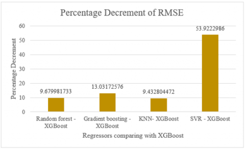 Figure 10 showcases the decrement in RMSE across various regression methods. In this analysis, KNN-XG Boost emerges as the leading approach with a significant RMSE decrement of 9.679981733. This is closely followed by the decrements observed in SVR, Gradient Boosting, and Random Forest Regression. The data clearly indicates that KNN-XG Boost outshines the other methods, demonstrating the most substantial reduction in RMSE and thereby yielding the most effective results among the evaluated approaches.