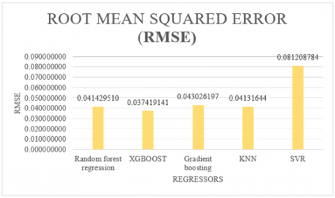 Figure 5 displays the RMSE rates for a variety of regression methods, including Random Forest Regression, Gradient Boosting, KNN, SVR, and the XG Boost Regressor. From this data, it becomes evident that the XG Boost Regressor outperforms the other methods, achieving the lowest RMSE rate of 0.146707803. This result underscores the superior accuracy of the XG Boost Regressor in comparison to its counterparts. Therefore, based on this evidence, it can be confidently concluded that the XG Boost Regressor is the most effective and reliable option for regression tasks in the context of this study.