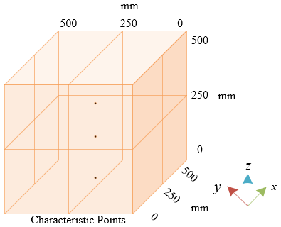 This paper first constructs a 3D model to describe how the heat within the composite material changes over time and across three-dimensional space. This model includes the material's density, specific heat capacity, and thermal conductivity, parameters that describe the material's ability to store and transfer heat. Figures 1 and 2 show the schematic diagrams of the characteristic points and surfaces of the bridge composite material samples. Assume the material density is represented by ϑ, specific heat capacity by z, temperature by s, and spatial position by a, b, and c. The following equation gives the three-dimensional transient heat conduction differential equation for the bridge composite material: