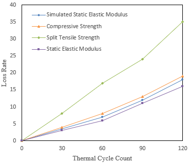It can be concluded that bridge composite materials experience continuous damage and performance degradation after undergoing thermal cycling. This could be due to microcracking caused by thermal stress, thermal aging, or changes in the chemical structure. The data indicate that the damage to the mortar and the loss of elastic modulus are cumulative, meaning that the damage caused by thermal cycling is irreversible and difficult to restore with simple repair measures. As the number of thermal cycles increases, the loss of elastic modulus in the composite material intensifies, indicating a reduction in thermal stability. Under extreme temperature cycling conditions, the material may not be able to maintain its original mechanical properties. The long-term behavior of composite materials under the influence of thermal cycling must be considered in bridge design. It may be necessary to select materials with higher thermal stability or design more conservative structures to compensate for the loss of strength and stiffness caused by thermal cycling. For existing bridges, regular assessment of the impact of thermal cycling on the material's elastic modulus is essential to ensure structural safety. As the loss rate increases, the structure may require more frequent inspections and possible reinforcement.