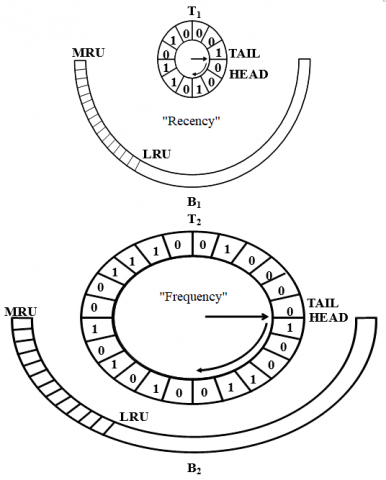 v. CLOCKs T2 and T1 contain pages that are currently in the cache, CLOCK T2 records frequency (F), and CLOCK T1 records recency (R).