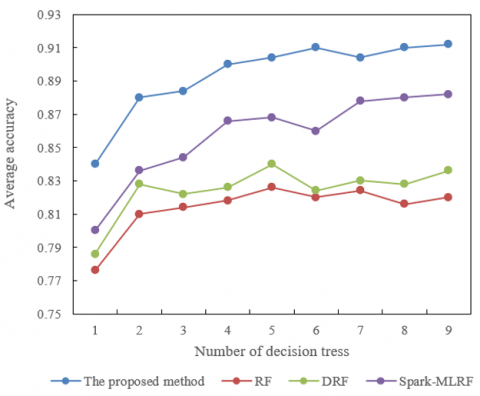 Figure 5 demonstrates the average accuracy of different predictive methods, including the proposed method, traditional Random Forest (RF), Improved Random Forest (DRF), and Spark Machine Learning Random Forest (Spark-MLRF), in predicting the employment structure of college graduates as the number of decision trees changes. The data show that as the number of decision trees increases, the predictive accuracy of all methods improves, but the proposed method consistently outperforms the others. Particularly when the number of decision trees reaches 9, the accuracy of the proposed method reaches 0.912, while the accuracies of RF, DRF, and Spark-MLRF are 0.82, 0.836, and 0.882, respectively. This indicates that increasing the number of decision trees can enhance predictive performance, but the proposed method demonstrates higher accuracy at each decision tree count level. These experimental results fully confirm the effectiveness and superiority of the Spark-IRF algorithm proposed in this paper for the predictive analysis of the employment structure of college graduates. By comparing with RF, DRF, and Spark-MLRF, the proposed method not only shows efficient processing capability when dealing with large data sets but also has significant advantages in predictive accuracy. This high-performance predictive analysis capability highlights the strong potential of cloud computing technology in data processing and analysis, particularly in understanding and predicting complex changes in employment structures.