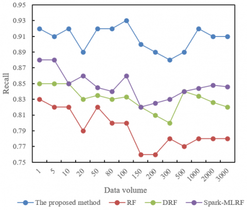 Figure 6 shows the comparison of recall rates of different predictive methods for college graduate employment structure as the data volume increases. The Spark-IRF algorithm proposed in this paper exhibits significant stability and superior performance, especially when the data volume exceeds 100 records, maintaining a recall rate above 0.89. Compared to other methods, particularly at higher data volumes (such as 2000 and 3000 records), this method's recall rate remains around 0.91, showing high stability and accuracy. In contrast, the recall rates of RF and DRF fluctuate more across different data volumes and overall perform less effectively than the proposed method. The Spark-MLRF performs similarly to the proposed method at smaller data volumes (1 to 50 records) but begins to decrease in recall rate as data volume increases, especially underperforming at larger data volumes. By demonstrating high recall rates at different data volumes, the proposed method not only effectively processes and analyzes large volumes of employment market data but also ensures the accuracy and reliability of the predictive results.