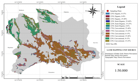 This research used an exploratory, descriptive survey method through a field survey approach and laboratory analysis results. The survey was conducted using a purposive sampling method. A working map is a unit of land map unit (LMU) consisting of the results of overlaying thematic maps, namely the Indonesian land map (RBI) of Purwantoro District, Wonogiri Regency, a map of diversity sources including the type of rice field management (by Wonoagung Organic Farmers Association), rainfall map (Climatology Data Portal), and slope map (Indonesian Geospatial Agency). The difference in rice field management consists of organic, semi-organic, and conventional rice fields (Figure 1). Rainfall in the study area is 2250mm/year and 1750mm/year. The slope is 0-8%, 8-15%, 15-25%, 25-40%. The results of the map overlay will produce a sampling map with the number of land mapping units (LMU) totaling 12 LMU (Figure 2). The sampling will repeat 3 points for each LMU, and the number of sampling points is 36 Soil samples were taken at 36 sampling points using a biopore drill method at a depth of 1-20 cm (tillage layer) of about 1 kg and in the vegetative phase of the plant (maturation phase). Soil samples that have been taken are then analyzed in the laboratory.