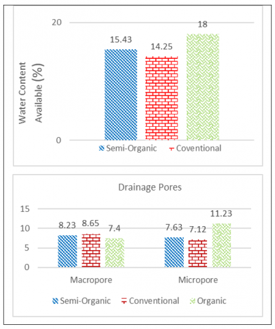 Semi-organic and conventional land management systems have almost the same value in pF 1 and 2. In contrast, the organic farming system has a higher value for pF 1 and 2, indicating that the water content in wet and dry conditions on organic land is higher than on semi-organic and conventional land, according to Latuamury and Hut [18], the water content in wet and dry conditions of soil is influenced by organic matter which increases the water storage capacity of soil [19]. It reduces the evaporation of water from the soil.
