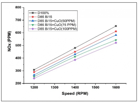 Figure 20 depicts the correlation between nitrogen oxide (NOx) emissions, measured in parts per million (PPM), and engine speed, measured in revolutions per minute (RPM), for various fuel mixtures. NOx emissions positively correlate with engine speed, rising from 1200 RPM to 1600 RPM across all fuel mixes. This phenomenon is anticipated since higher engine speeds often lead to elevated combustion temperatures, which in turn cause an increase in the generation of NOx. At all engine speeds, using 15% biodiesel (D85 Bi15) results in lower NOx emissions than using 100% diesel (D100%). The decrease in NOx emissions may be ascribed to the oxygen content in biodiesel, which facilitates enhanced combustion and thus reduces NOx emissions. Adding CuO nanoparticles to biodiesel blends leads to an additional decrease in NOx emissions [28]. The decline is more noticeable with greater concentrations of CuO. At 1600 RPM, D85B15 CuO100 emits 521 ppm NOx, a 17.3% reduction compared to the 611 ppm from the D85B15 blend.