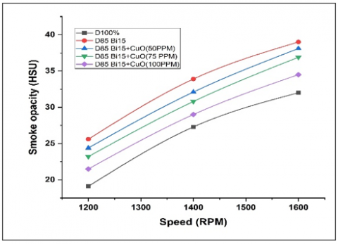 Figure 21 illustrates that smoke emissions from CuO nanoparticle additive fuel blends are lower than those from diesel. At 1600 RPM, smoke emissions were 39 HSU for D85B15, 34.5 HSU for D85B15 CuO100, and 32 HSU for diesel. The reduction in smoke emissions for D85B15 CuO100 compared to D85B15 is attributed to the high surface-to-volume ratio of CuO nanoparticles, which improve mixture formation, evaporation, and ignition characteristics, leading to a shorter ignition delay. This finding aligns with other research [28, 41-43], showing a 13.04% reduction in smoke emissions for B20CuO100 compared to B20.