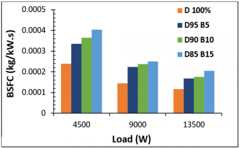Figure 9 illustrates how brake-specific fuel consumption (BSFC) varies as the engine operates at speeds of 1200rpm, 1400rpm, and 1600rpm, with a load of 13500W. All fuel mixtures exhibit a consistent trend, with the lowest BSFC values occurring at 1600rpm and the highest at 1200rpm. Notably, diesel consistently achieves the lowest BSFC levels across the entire speed range. Researchers have observed a similar deviation in BSFC for sunflower biodiesel compared to diesel [27]. This discrepancy is attributed to the lower calorific value of biodiesel. Compromising measures are necessary to achieve the same energy output due to this lower calorific value. As anticipated, the addition of biodiesel to diesel leads to increased fuel consumption, dependent on load and operating conditions.