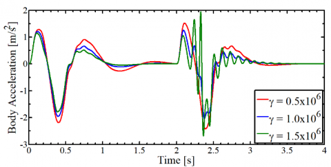 $\begin{array}{r}M_b \ddot{y}_b(t)+b_s\left(\dot{y}_b(t)-\dot{y}_w(t)\right)+k_s\left(y_b(t)-\right. \left.y_w(t)\right)=u(t)\end{array}$ (1)