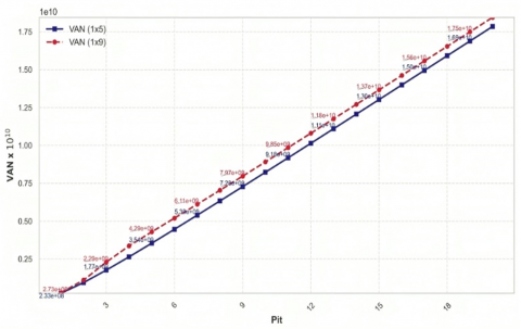 Table 11 demonstrates that, when employing 1×9 arches under identical economic conditions, the Net Present Value (NPV) reaches \$2,784.62 MUS$ in the baseline scenario, accompanied by a Waste-Ore Ratio (REM) of 0.79. This indicates that, despite the 1×9 arches facilitating the extraction of a greater quantity of ore, the 1×5 arches exhibit superior economic efficiency, as evidenced by their enhanced NPV and reduced REM.