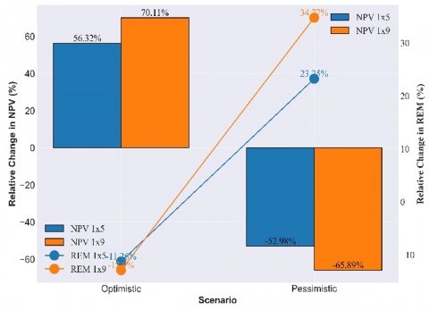 Figure 16 illustrates the percentage changes in NPV and REM across economic scenarios. For the 1×5 arches, the NPV increases by 56.32% in the optimistic scenario, while it decreases by 52.98% in the pessimistic scenario. In contrast, the 1×9 arches exhibit a more dramatic shift, with an increase of 70.11% in the optimistic scenario and a decrease of 65.89% in the pessimistic scenario. Moreover, the REM decreases by 11.26% for the 1×5 arches and 12.90% for the 1×9 arches in the optimistic scenario, whereas in the pessimistic scenario, they increase by 23.25% and 34.77%, respectively.