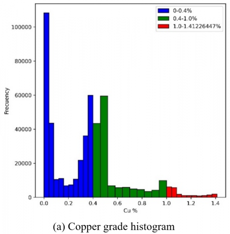 In this research, an Exploratory Data Analysis (EDA) was conducted to explore the distribution of copper ore grade within the block model, as depicted in Figure 2. It was found that the copper ore grade ranges from a minimum of 0.00% to a maximum of 1.41%.