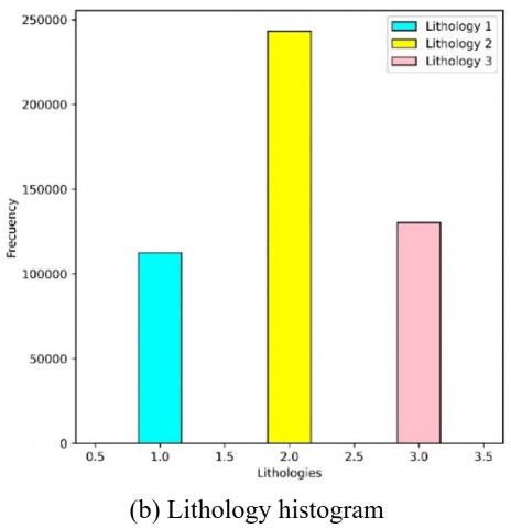 According to Figure 4, which displays the histogram of copper grades and lithologies, the copper grades are divided into three categories: low (blue), medium (green), and high (red). A total of 315,895.00 blocks had a low copper grade (between 0.00% and 0.40%), 1,482,214.00 blocks had a medium copper grade (between 0.40% and 1.00%), and 21,891.00 blocks had a high copper grade (between 1.00% and 1.42%). Regarding lithologies, 112,486.00 blocks were classified under lithologic code 1, 243,267.00 blocks under lithologic code 2, and 130,247 blocks under lithologic code 3, resulting in a total of 486,000.00 blocks.
