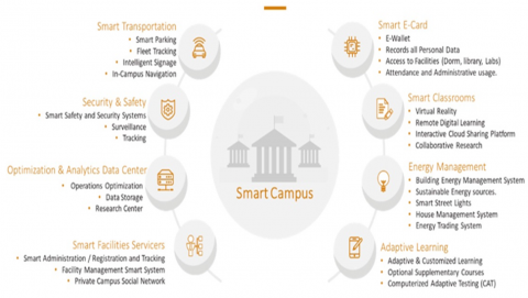 A smart university can be defined as a small city since it can be a way to reach a smart city. The regulation of both academic and administrative processes and sustainability in universities is of great importance for the formation of self-sufficient campuses. The search about the socioeconomic organization of a city leads us to consider universities as perfect environments for small-scale testing. The Smart Campus concept can be created by applying the approaches of the smart city on the university area. The university campuses are characterized by their human resources, which ought to embrace and develop the innovations and facilities applied by smart approaches. Universities are areas where energy is consumed because of crowdedness. This consumption can be controlled in smart universities [1]. Traditional universities lack the requirements of the 21st century; most of the universities are old without any real renovation; as there is no totally smart-green campus, lack of smart infrastructure, buildings, and appropriate information technology, and so, many universities around the world need to adopt the smart university concept to improve the quality of education, ensure energy efficiency, and improve management services. The smart university uses advanced technologies to provide different services [2].