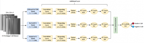 Researchers designed a proposed Concatenation Model for the detection of coronary artery disease with input dimensions of 224×224. This model uses three modified models, with similar input dimensions. The structure of this model is shown in Figure 1 and the detailed parameters for each layer in the architecture are shown in Table 2 to provide a better understanding of our proposed model.