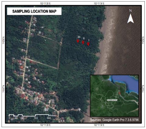 This study was conducted from February to July 2023 in the Sungai Bersejarah mangrove ecotourism area of Kayu Ara Permai Village, Sungai Apit District, Siak Regency, Riau, Indonesia. Since 2018, this area has been managed by a community organization engaged in mangroves, namely, the Laskar Mandiri Conservation Group formed by the people of Kayu Ara Permai Village. This organization manages the mangrove forest as an educational tourism center and conducts conservation efforts. Geographically, the research site is located at latitude 1°07' 02.2″ N and longitude 102°11' 34.2″ E in the Siak River Basin, with a sloping beach facing Tebing Tinggi Island and Padang Island, Bengkalis Regency, as shown in Figure 1.