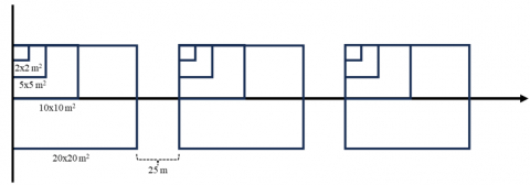 Data on plant species, fauna, and environmental quality were collected through field observations using a combination of transect and plot methods [19]. Transects divided the mangrove ecosystem into different zones based on water depth, salinity, and tidal influence. Mangrove species and density data were obtained from plots measuring 20 × 20 m (tree level), 10 × 10 m (pole level), 5 × 5 m (sapling level), and 2 × 2 m (seedlings, lianas, and other understory levels). Three test plots were established in each transect, with a distance of 25 m between them, and arranged systematically. Transects extend from the coast perpendicularly inland, traversing the mangrove community from the foremost formation (offshore) to the rearmost formation bordering the mainland [26]. An illustration of the observation plot layout is shown in Figure 3.