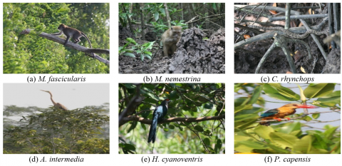 Faunal data were collected in situ using a visual recording method with a camera [31]. This method involves the direct observation of visually detectable fauna in mangrove areas. Cameras were strategically placed to capture images and videos of animal activity, providing valuable information on the presence of the species. The use of camera traps and video recordings facilitates the non-invasive observation of mammals, reptiles, birds, and fish at the study site.