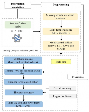 Figure 2 shows process to evaluate the LULC change and its impact on the dry forest of Peru. The construction of time series of S2 images was carried out, then the extraction of clouds and cloud shadows was applied. We then compute the spectral indices and perform the RF classification using training data. Finally, the precision of the generated cartography was calculated.