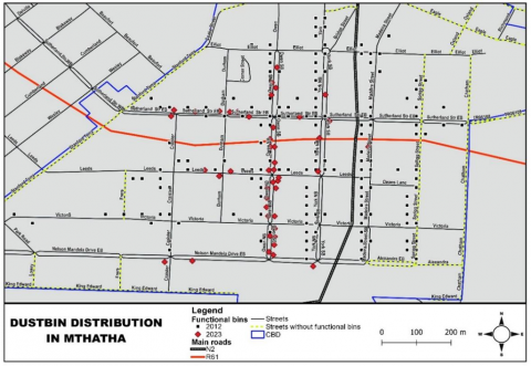 Managing municipal solid waste is one of the most crucial services municipal authorities provide in developing nations to maintain clean cities. However, in many cities in the Eastern Cape, the municipal solid waste is still not managed properly. Thus, this study compared the distribution of dustbins in Mthatha's Central Business District between 2012 and 2023. In addition, this study investigated the strategies the municipality employs to manage its solid waste. The distribution of dustbins was recorded using the Global Positioning System. Additionally, questionnaires were distributed to investigate the strategies that the town employs to manage its waste. The findings revealed statistically significant variations in the frequency of operational and non-functional dustbins in 2023 and 2012. The study also showed that Mthatha has issues in managing solid waste, which include a lack of compliance by urban dwellers, population growth, and financial constraints among others. We conclude that for waste management in Mthatha to be successful, technologies like geographic information systems must be used when distributing dustbins. Finally, this study demonstrated that urban dweller collaboration is essential for good municipal solid waste management, which depends on more than just government officials.