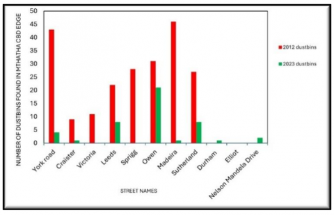 Figure 2. Comparison of functional dustbin which were found in Mthatha between 2012 and 2023