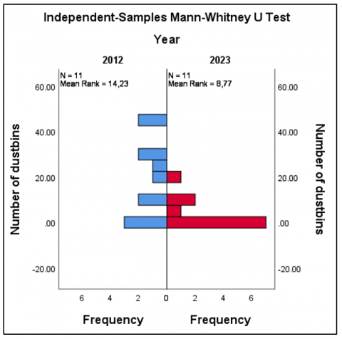 Figure 4. Mann Whitney U test output results for functional dustbins found in Mthatha CBD between 2012 (in blue colour) and 2023 (in red colour)