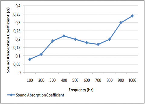 The experimental results for natural Gaba-Gaba fibers are detailed in Table 1 and Table 2, while the graphs illustrating the relationship between sound intensity and the sound absorption coefficient are presented in Figures 3 and 4. The tested material exhibits relatively low sound absorption coefficient values for Gaba-Gaba with a thickness of 2 cm. Specifically, the coefficient ranges from 0.06 to 0.30 across frequencies of 100 to 1000 Hz (see Table 1). The highest coefficient value of 0.30 occurs at 400 Hz, whereas the lowest is 0.06 at 100 Hz. Figure 10 shows the relationship between the sound absorption coefficient (α) and frequency. The test results indicate that natural Gaba-Gaba serves as a reflector, suggesting that additional materials are necessary to achieve sound absorption coefficients greater than 0.30 within the 100-1000 Hz frequency range.
