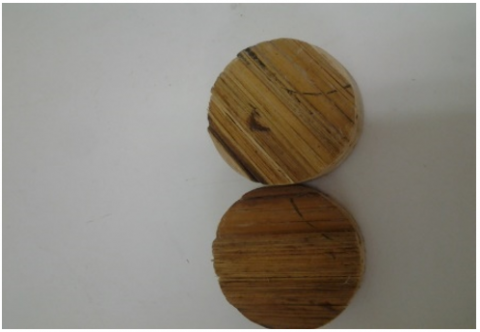 Once the stalks have expanded and flattened, the next step is to manually dry them for about one month. The subsequent process should not begin until the material has reached a water content of 10% or less. If the water content remains above 10%, additional drying is required until it reaches the maximum of 10%. Figure 4 shows the drying process of sago leaf stalk material.