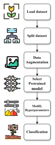 In this study, a transfer learning method is proposed for utilizing pre-trained models, trained on a large datasets. Thus, the cost and time of training new deep learning models are reduced. As shown in Figure 1, six steps are implemented in the workflow. At first, selecting a suitable dataset and the choice fell on Indonesia Medicinal Plant dataset [5] after that apply preprocessing techniques on the dataset, splitting it into 60% training data and 40% validation data. Then applying augmentation processes such as rotation, translation and zoom. The next step is the most important step which is selecting a pretrained model. The pretrained model is automatically extracts the features from the training data then validates and tests the validation data. Finally, competitive the best hyperparameters are selected by manual comprehensive experiments. The selected hyperparameters are displayed in Table 2 below.