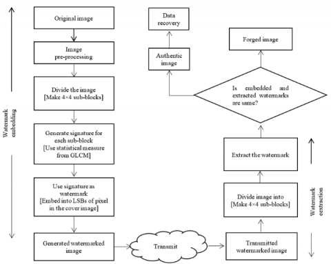 The proposed approach involves four stages: signature/watermark creation, watermark encoding, watermark extraction, and recovery of data.
