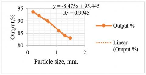Based on the experimental results, a statistical mathematical model of the technological process was developed, and subsequently, the optimal operational mode was determined using this model. Figure 12 illustrates the dependency of alunite on various technological parameters such as temperature, particle size, and ore annealing conditions. It shows a significant decrease in yield as the size of annealed alunite particles decreases. Similar trends were observed with respect to particle size, where yields decrease notably within the range of 0.2-1.5 mm. Additionally, when annealed alunite samples were treated with sulfite acid, increasing the solution temperature from 298 K to 348 K resulted in a slight decrease in solution yield. Table 4 provides a summary of the levels and intervals of variation for these factors.