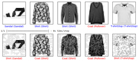 We have implemented offensive attacks on the trained Fashion-MNIST neural network model using the Python TensorFlow library and the Keras programming interface. The attack method follows the Fast Gradient Sign Method (FGSM). For each selected test image, a distorted image is generated by calculating the image gradients relative to the model loss function, as shown in Eq. (10).