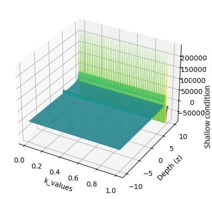 In deep water, the thermocline regime as indicated in Figure 2 is associated with the distribution of temperature vertically with depth. So, thermocline is the depth interval where there is a significant change in water temperature, salinity, and other deep water properties. Hence, bottom boundary condition plays very significant role in determining the thermocline regime in a stratified deep water under modified gravity, where, $\eta $ is the free surface elevation and $\phi $ is the surface flux for the flow.