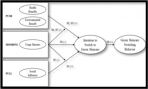 To understand consumer intentions and behaviors in switching from conventional skincare products to green skincare products, this study adopts the Push-Pull-Mooring (PPM) framework [21]. Most studies on individual behavior related to green skincare products use Planned Behavior Theory as a predictive model [10, 15, 16]. Although the PPM theory is effective in predicting transition behaviors in various fields, no research applies explicitly to examine the transition to green skincare products. Therefore, this study aims to fill the gap by applying the PPM model. In this context, health and environmental benefits act as Push factors, social influences as Pull factors, and barriers to use as Mooring factors. The relevance of the PPM theory in this study is to provide a comprehensive framework to understand various factors that affect the consumer transition. This study focuses on several key questions: (1) how do social influences, health benefits, and environmental benefits affect consumer intent to switch to green skincare products? (2) how barriers to using moderate the relationship between social influences, health benefits, and environmental benefits and switching intentions; and (3) how switching intentions affect consumer switching behavior. The results of this study are expected to make a theoretical contribution by expanding the application of PPM theory to the context of green skincare products, as well as providing practical implications for skincare manufacturers and marketers in designing more effective marketing strategies, as well as offering insight to policymakers in developing regulations that support the adoption of green skincare products in Indonesia.