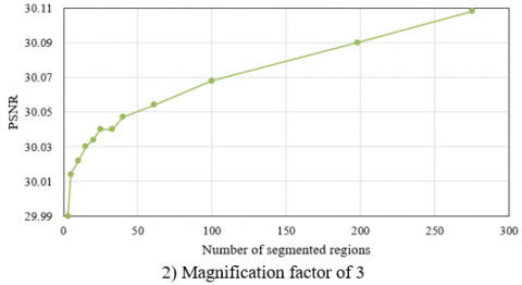 Figure 4. Curves showing the change in PSNR with varying numbers of sub-image regions for different magnification factors